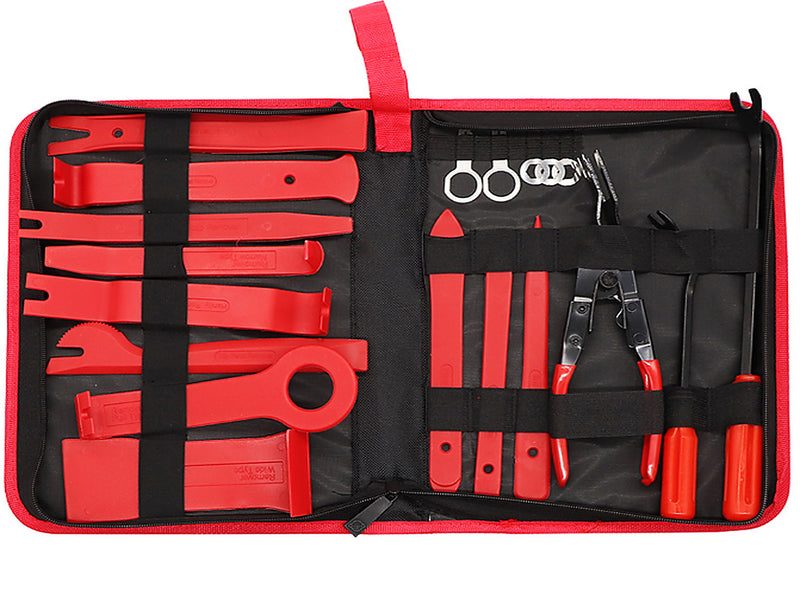 Das 19-teilige KFZ Verkleidungshebel-Set ist ein professionelles Montage- und Demontagewerkzeug für Innenraumverkleidungen, Zierleisten, Türverkleidungen, Clips, Kunststoffbefestigungen, Armaturenbrett-Teile, Verkleidungsklammern und Autoradios.