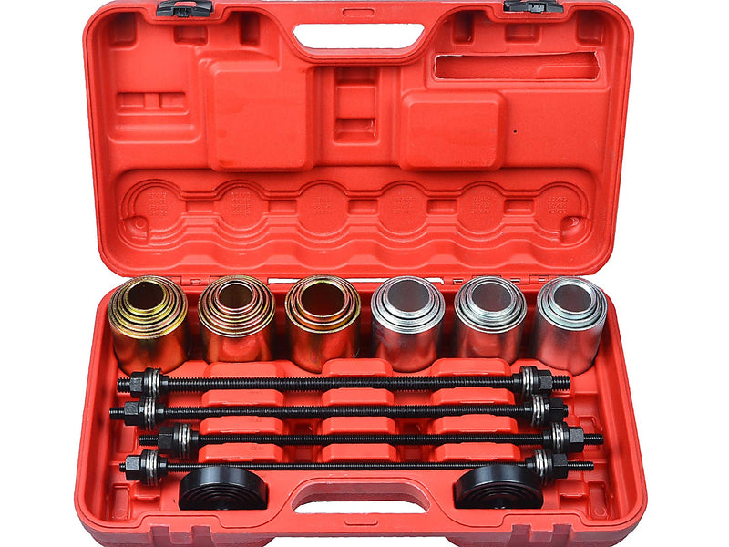 Mit diesem 26-teiligen Press- und Zughülsen-Set bist du bestens ausgestattet, um Buchsen, Lager und Dichtungen fachgerecht zu entfernen und einzupressen – ganz ohne Beschädigungen an Fahrzeugteilen. Das Set eignet sich für eine Vielzahl von PKW, Transportern und leichten Nutzfahrzeugen und ist damit ein unverzichtbares KFZ-Spezialwerkzeug für jede Werkstatt.