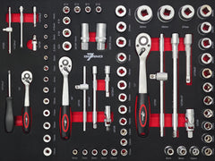 1/2", 3/8" und 1/4" Stecknüsse, Verlängerungen, Universalgelenke, Ratschen, Zündkerzen-Nüsse und TX-E-Stecknüsse – für alle gängigen Verschraubungen.