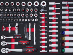 Enthält 1/2", 3/8" und 1/4" Stecknüsse, Deep Sockets, Verlängerungen, Universalgelenke und Ratschen – ideal für schnelle Verschraubungen.