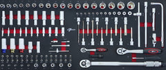 Schublade 1: Stecknüsse, Tiefe Stecknüsse, E-Nüsse, Felgenschlagnüsse, Verlängerungen, Universalgelenk, Vielzahn Schlagnuss, Ratschen, Drehmomentschlüssel