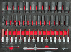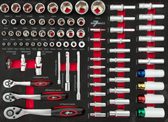 Schublade 1 (80 Teile): Steckschlüsselsätze, Knarren, Verlängerungen, Bits